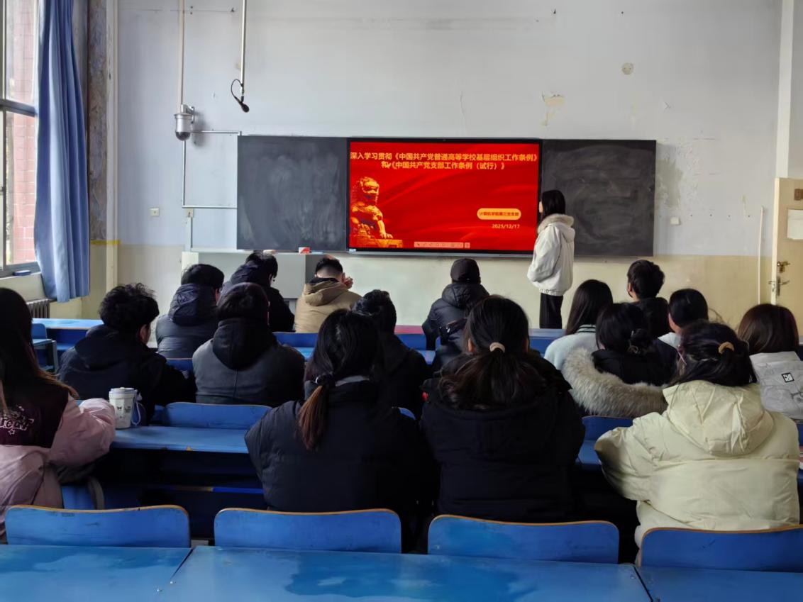 本次党课围绕《中国共产党普通高等学校基层组织工作条例》和《中国共产党支部工作条例(试行)》的核心要义展开,系统解读了高校基层党组织的政治功能、职责定位与工作要求。党课内容聚焦学生党支部建设实务,阐释了党支部战斗堡垒作用和党员先锋模范作用的实践路径,引导学生党员深刻把握党建工作与学业成长、价值塑造的融合点,学会以党建思想引领学术探索方向,用党性修养涵养优良学风,在服务同学、奉献社会的实践中践行青年党员的初心使命。