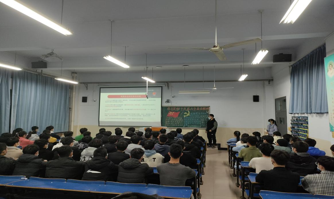会议开始,付星博向同学们介绍了十九届六中全会的基本信息及中国共产党的党代会制度。接着,他以中国共产党百年历史上的“三个历史决议”为主线,梳理了党百年征程中的重大历史事件、制定三个决议的历史背景、三个决议的伟大历史意义,从而展现了党强烈的历史自觉和百年奋斗历程。然后,以《中共中央关于党的百年奋斗重大成就和历史经验的决议》为依托,与同学们分享交流了“为什么要总结党的百年奋斗重大成就和历史经验”这一重要问题,引领同学们深入领会学习中国共产党百年奋斗重大成就和历史经验的重大意义。最后,付星博结合自身的成长经历,和同学们交流了新时代青年大学生的使命与担当。他向同学们分享时说:“作为新时代的青年大学生,生逢盛世,要珍惜大学宝贵时间,发扬团结、拼搏、奋斗的精神,善于总结经验,努力学好专业技能,提升本领。”