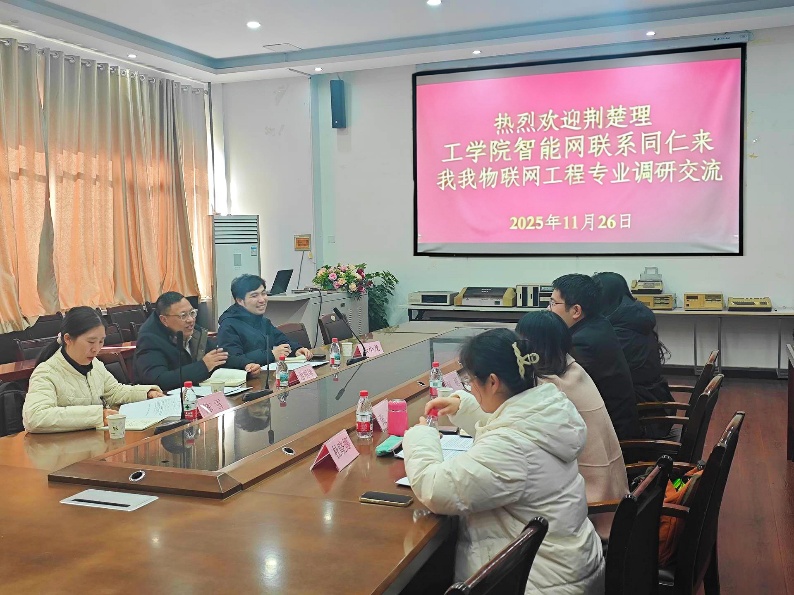 2025年11月26日,荆楚理工学院人工智能学院智能网联系游明坤主任、智能科学与技术专业负责人朱小龙、物联网工程教研室主任陈雪一行来访我院,就物联网工程专业建设开展调研交流。我院副院长何栎、物联网工程系主任张鸿、物联网工程系教师刘珺、杜晓娜参加交流会议。