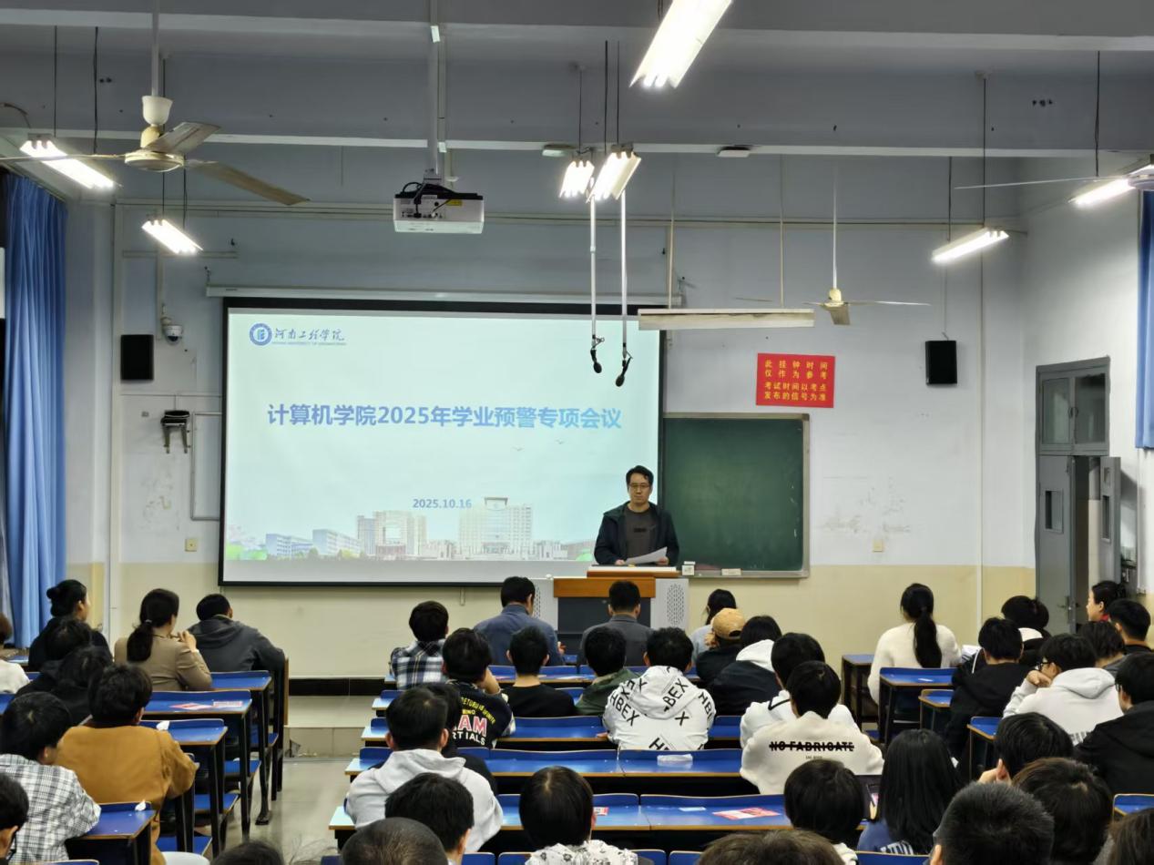 10月16日,计算机学院在教学楼6303召开2025-2026学年第一学期学业预警工作会议,会议由副书记陈亮主持,副院长于海鹏、三个专业的专业负责人和教务办、学工办老师及全体红色、橙色预警学生参加了会议。